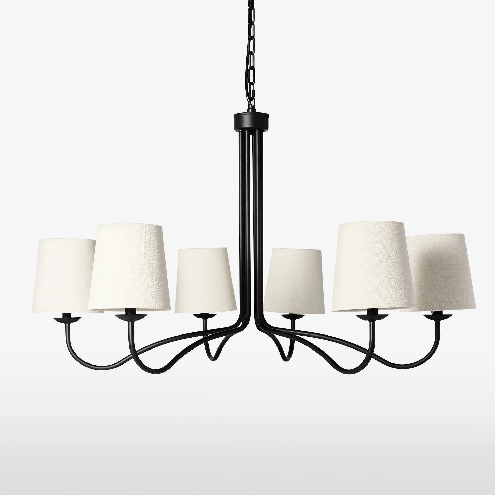 Boasting an open design, this chandelier showcases a sleek metal body holding six bell shades to illuminate your space in modern style. Install it above the dining room table or kitchen island to cast a welcoming glow over family dinners or casual get-togethers.
