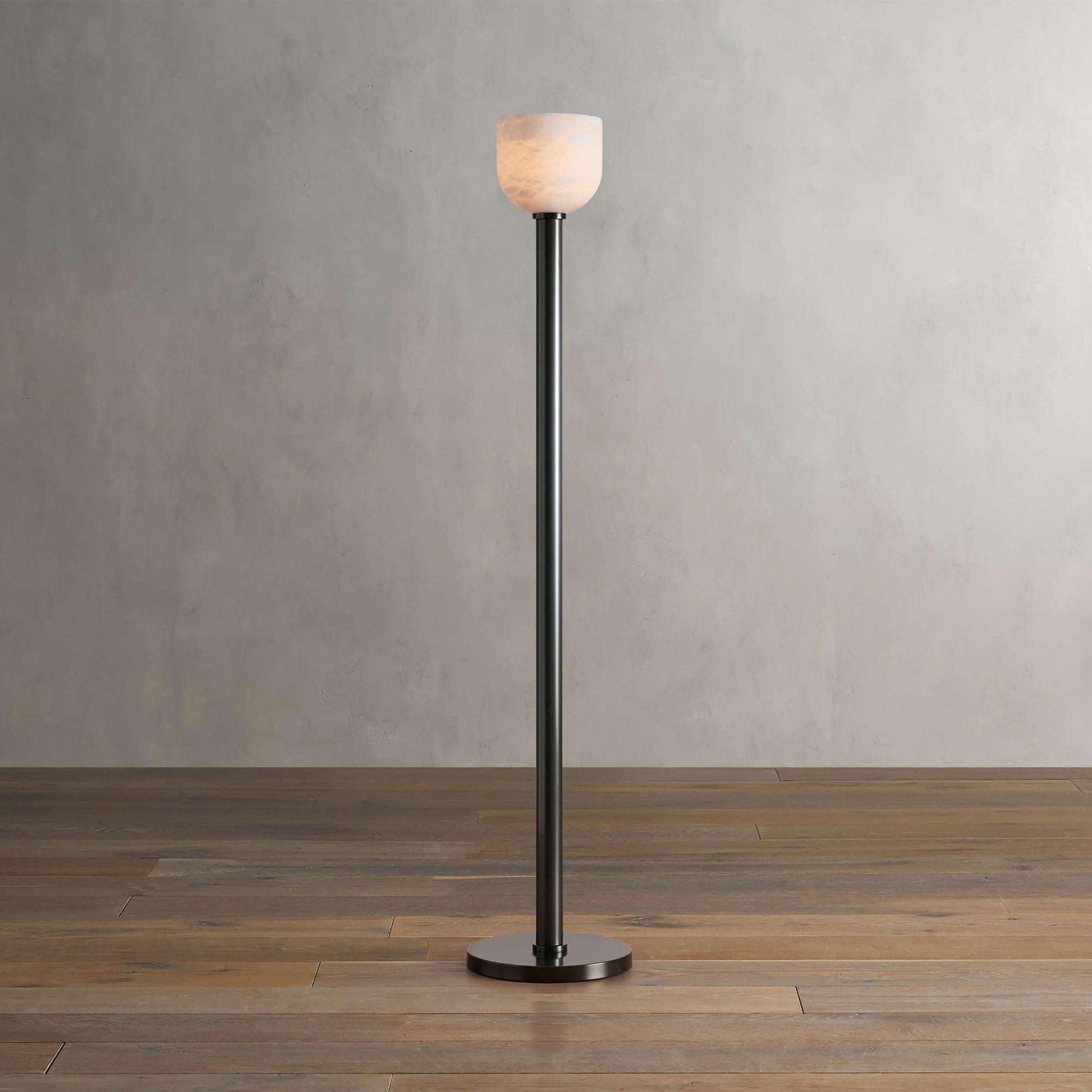 The Ansley Floor Lamp features a sleek torch design crafted from metal and natural alabaster. Its upward glow creates a warm, inviting ambiance while showcasing the intricate swirls and unique veining of the alabaster, adding an elegant touch to any room.