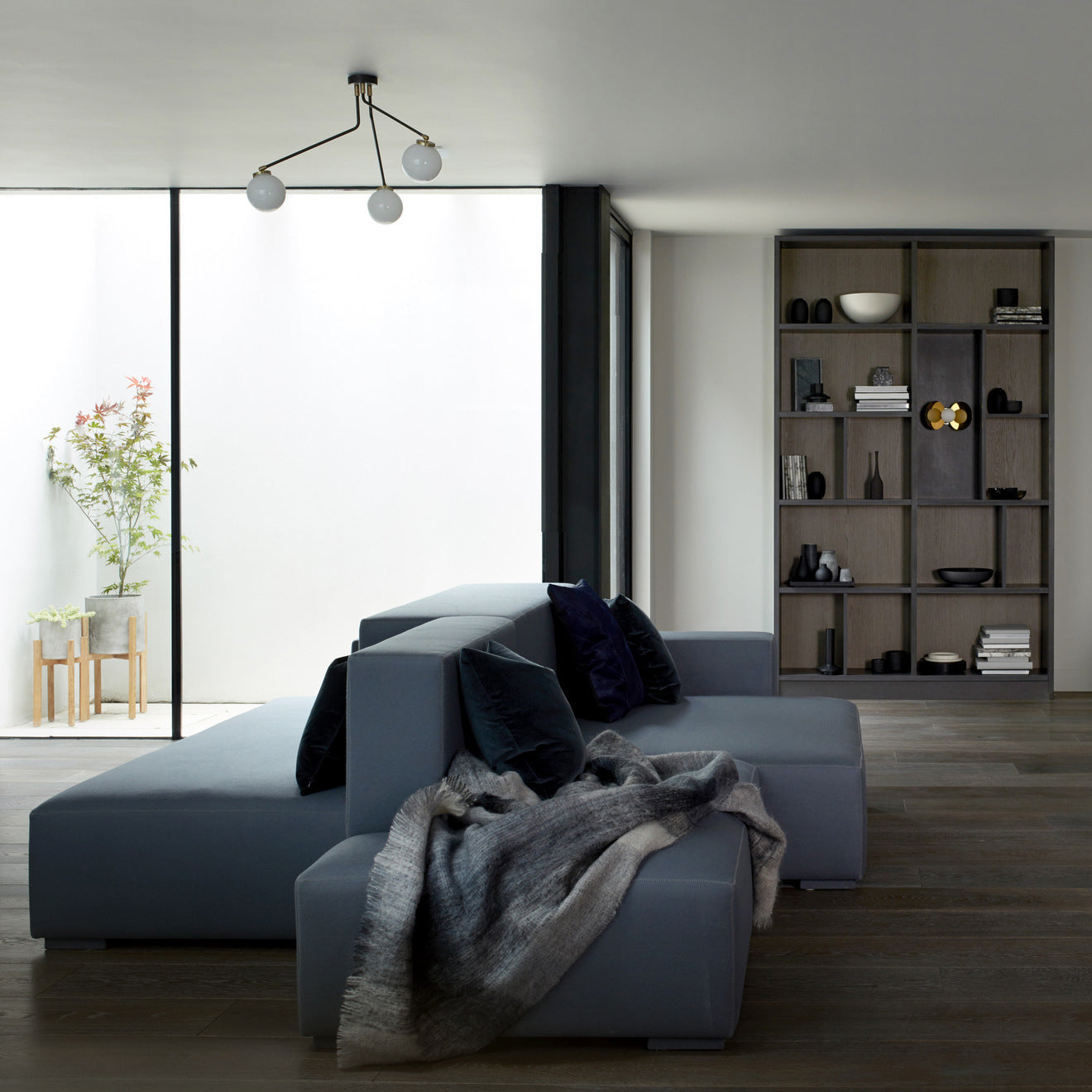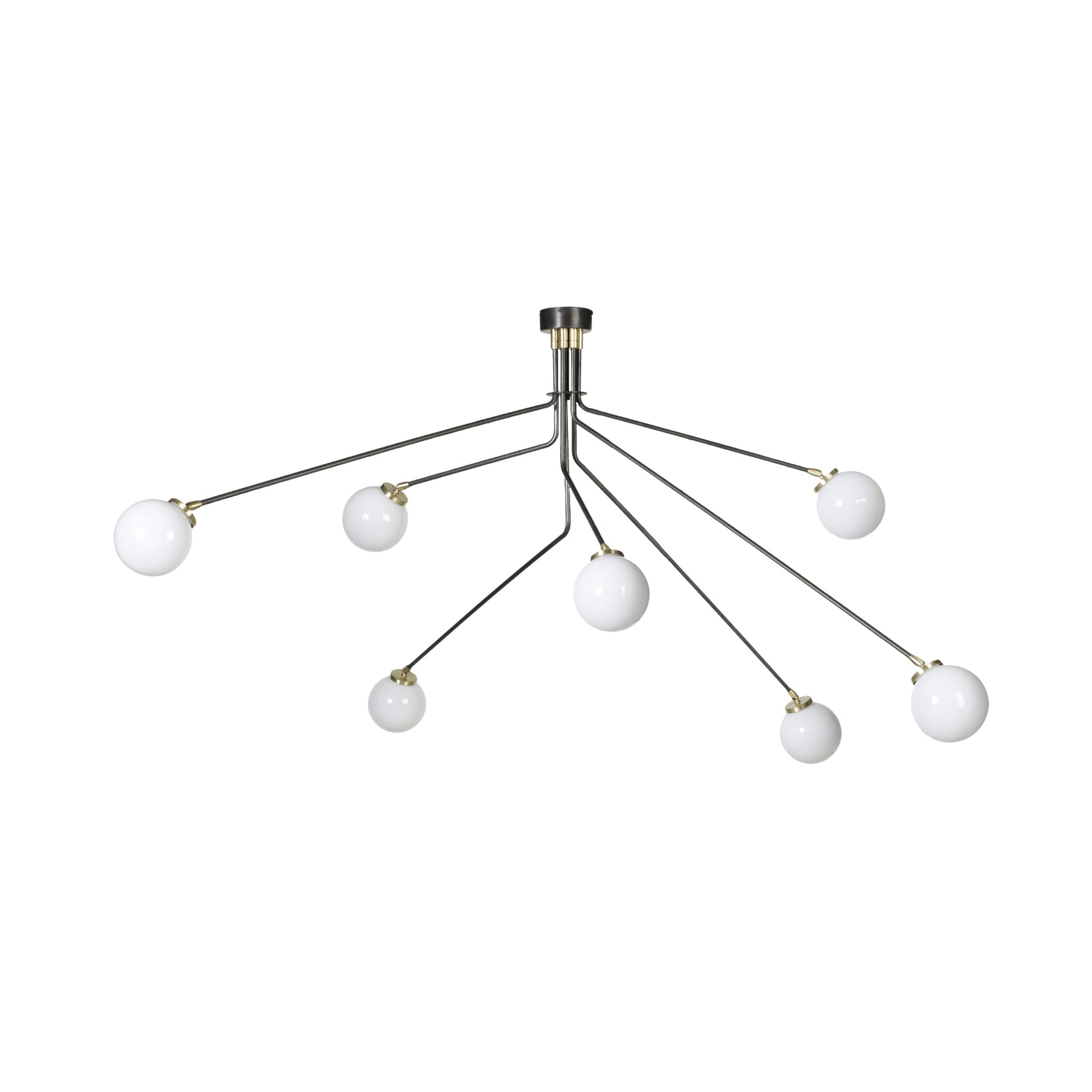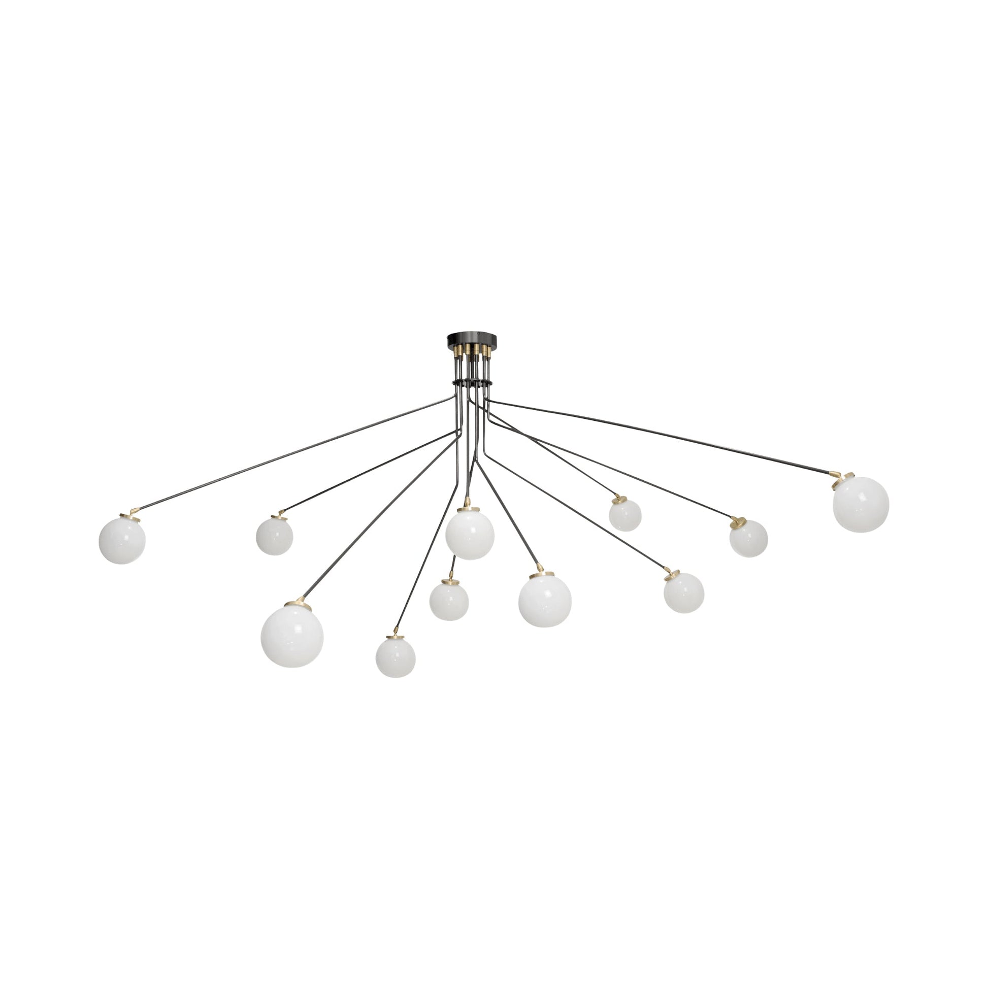 Inspired by the Italy of the 60’s. Familiar yet modern, its distinctive form with rotating arms and hand-blown white shades allow the sculptural piece to be repositioned. The metalwork is brass, then black and hand waxed which contrasts with the brass detailing.