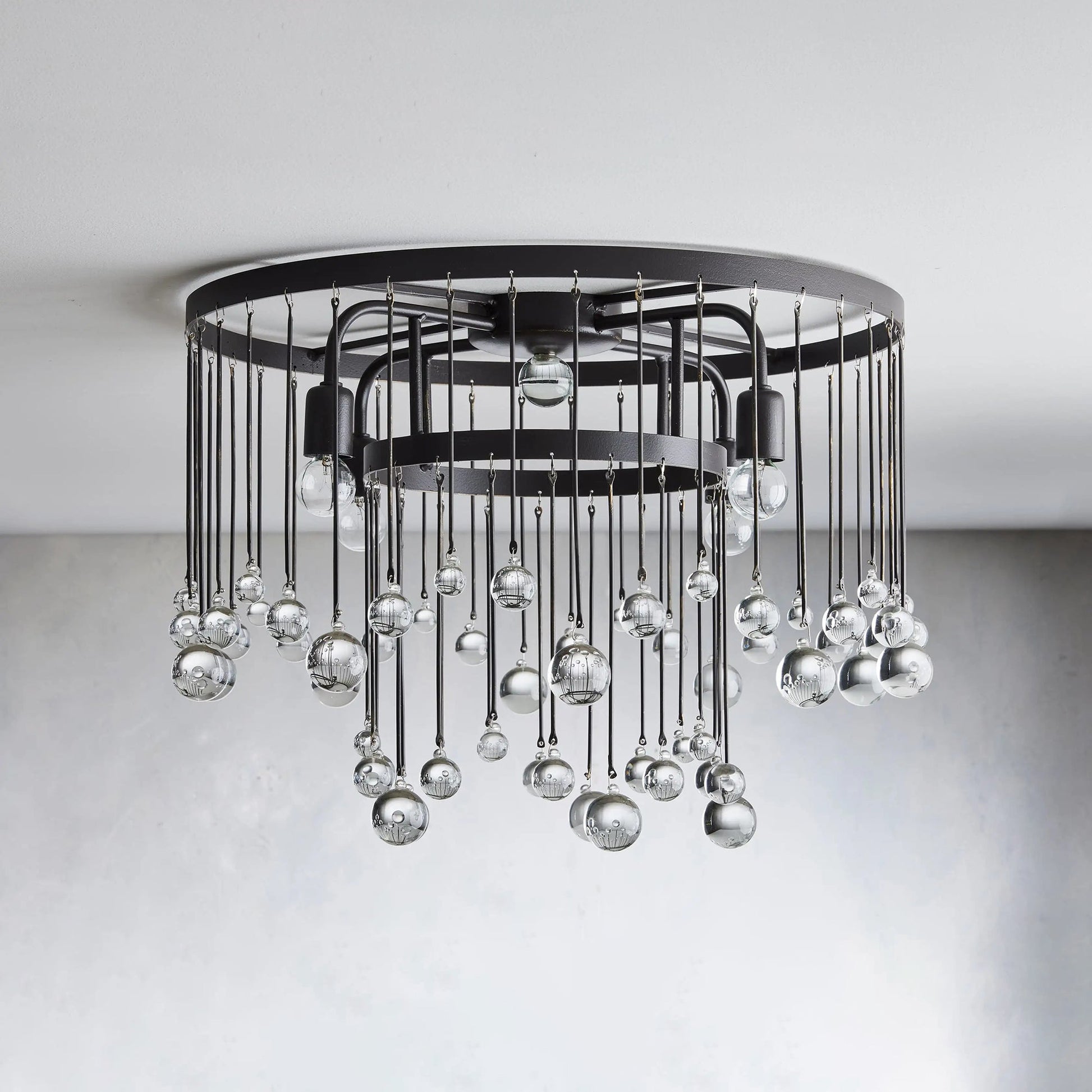 The Aubrey Flush Mount Ceiling Lamp brings elegance to any space with its crystal drops and iron cage design. Perfect for both traditional and modern settings, this lamp creates a stunning visual effect with its refraction of light. Add a touch of luxury to your home with this versatile and eye-catching piece.
