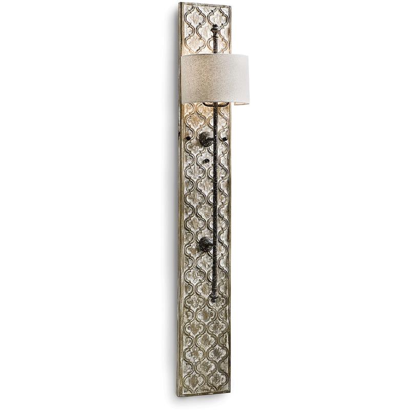 Textured and exuding a regal appeal, the Carved Panel Sconce evokes an aspirational charm. The aged whitewash finish of the quatrefoil-patterned wooden panel perfectly pairs with the rustic blackened iron arm, and an oatmeal shade completes the design.