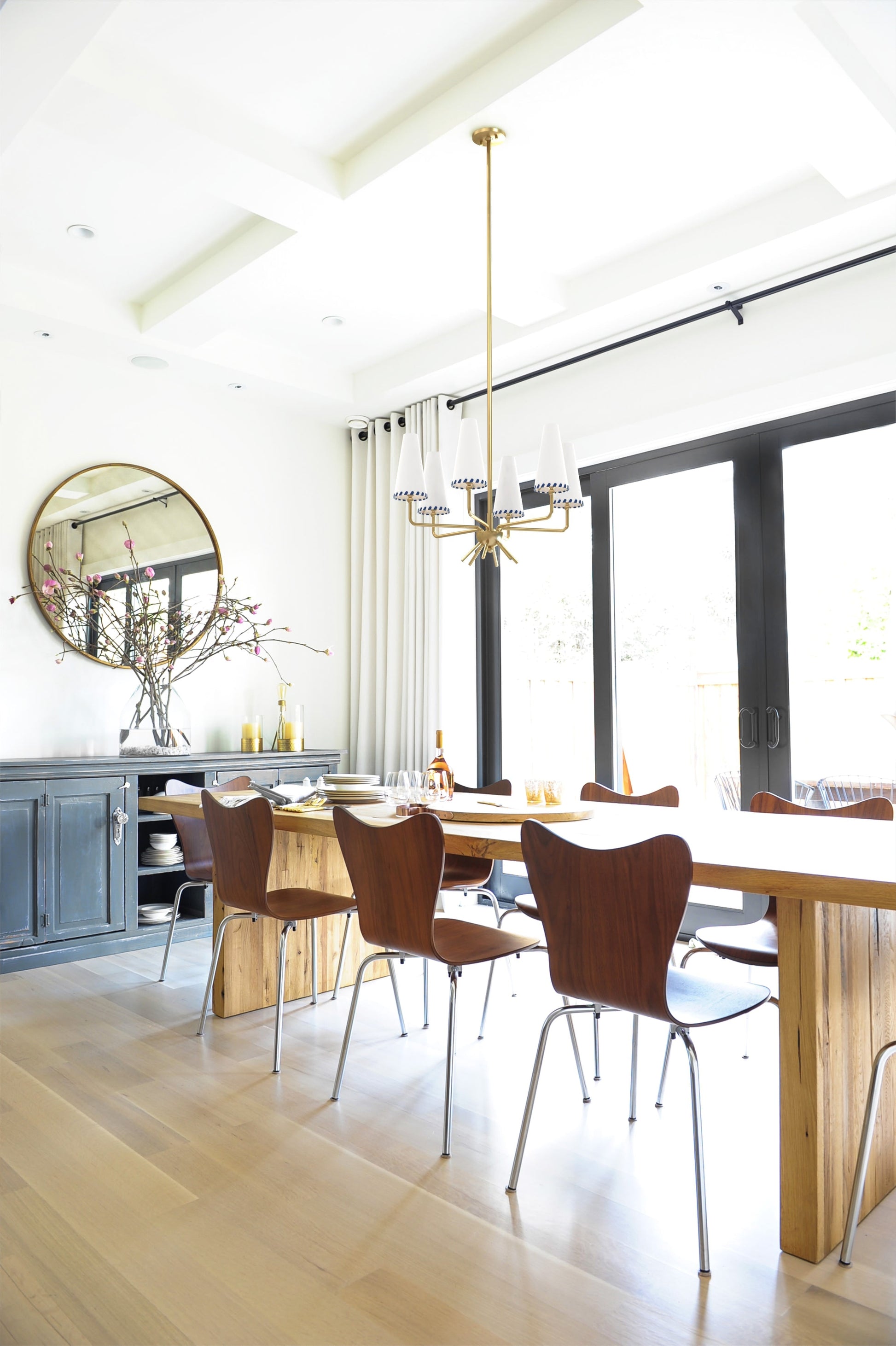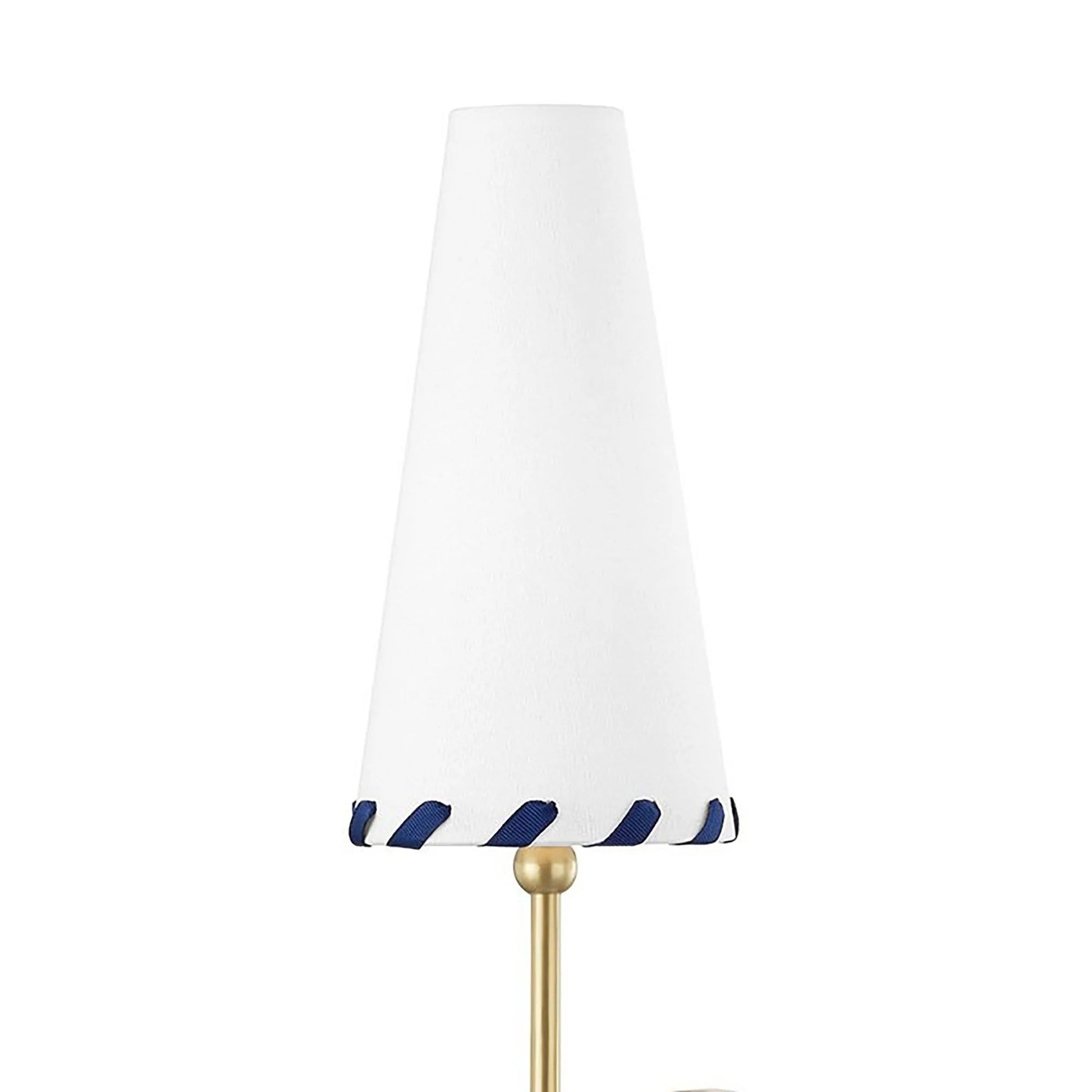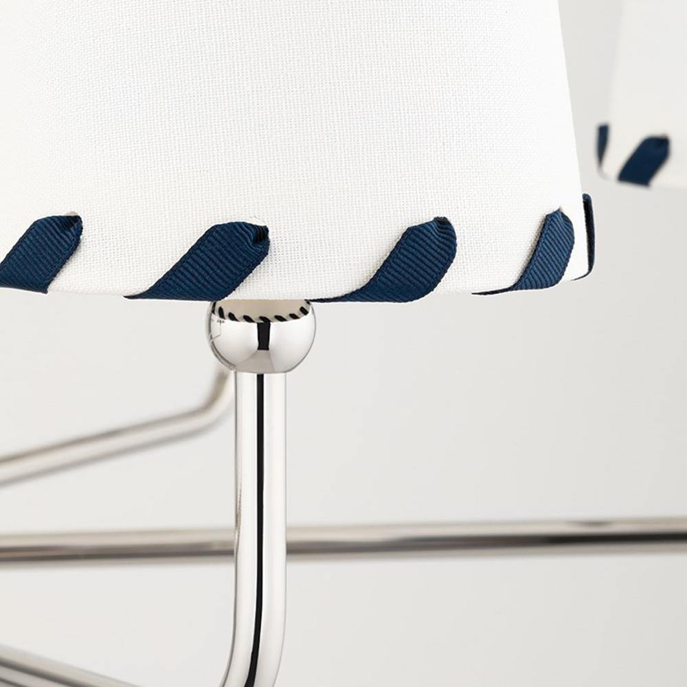Belgian linen shades with a ribbon of blue are attached to metallic arms in Aged Brass to bring a fresh, clean look anywhere you place this fixture. Decorative brass arms hang from a bell-shaped base to give the 6-shade chandelier an unexpected something extra.