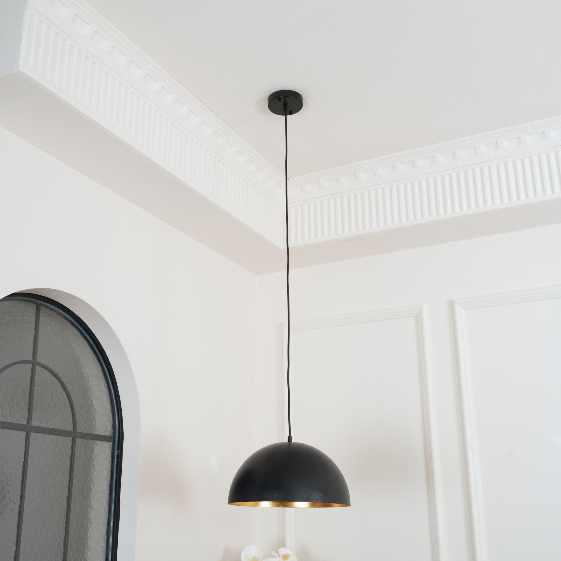Introduce some industrial flair to your space with the Lipeo Pendant Lamp. Its classic domed design, textured black finish, and luxury gold-leaf interior make it a versatile addition to any room. Perfect for cool lofts or minimalist settings, this crowd-pleasing lamp is sure to impress.